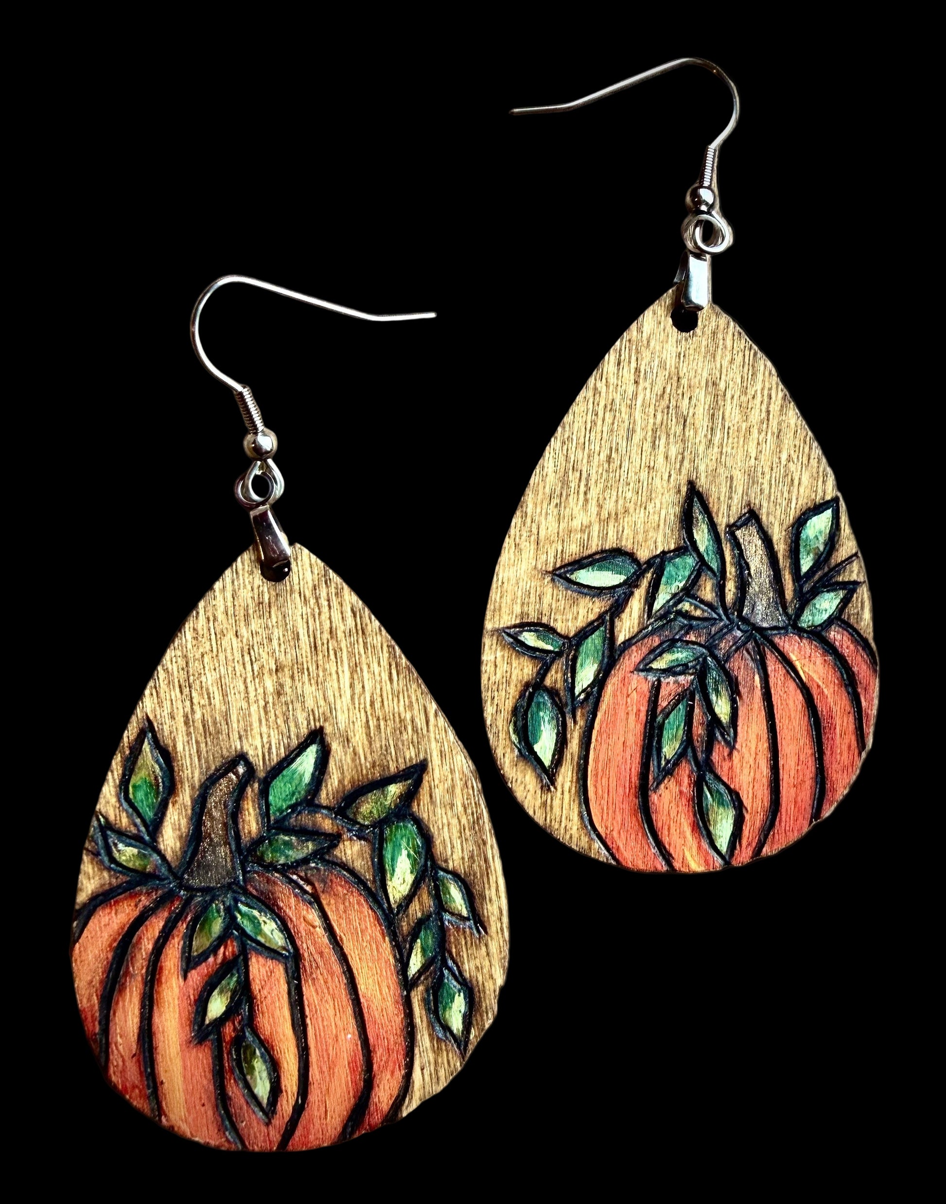 Sweet pumpkin earrings for all things harvest! The outline is wood burned and completed with painted detail. These are lightweight with standard wire hooks, and a great steal ahead of next year’s Halloween season!